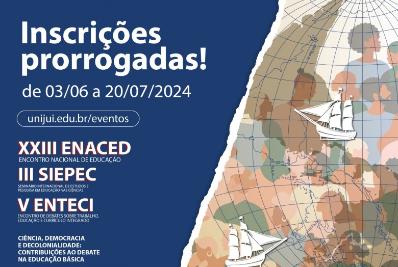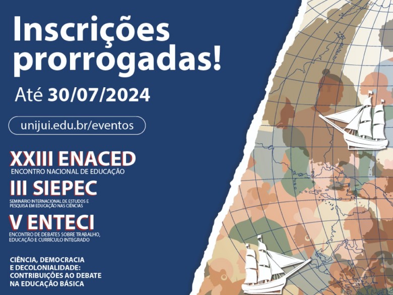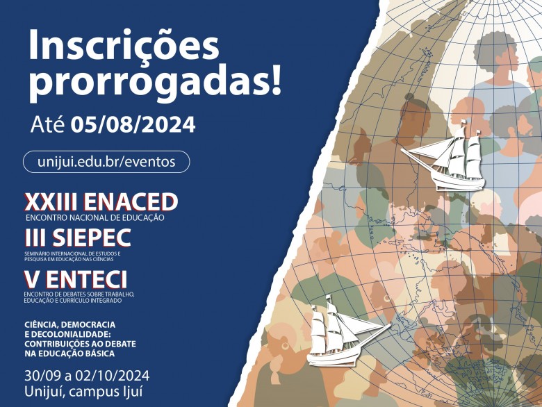 Com a mudança de data do XXIII Enaced - Encontro Nacional de Educação, para os dias 30 de setembro a 2 de outubro, foram prorrogadas as inscrições para o dia 20 de julho. O evento será realizado no campus da Unijuí em Ijuí, em paralelo com o III Siepe - Seminário Internacional de Estudos e Pesquisa em Educação nas Ciências e com o V Enteci - Encontro de Debates sobre Trabalho, Educação e Currículo Integrado. Interessados podem se inscrever em unijui.edu.br/eventos, página onde também é possível conferir a programação.