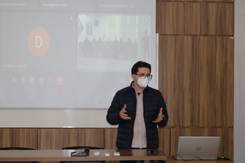 A programação teve início às 14h, com fala do professor Rafael Frantz e apresentação do trabalho “Jabuti: A DSL for Writing Smart Contracts in Application Integration” pelo doutorando em Modelagem Matemática e Computacional da Unijuí, Eldair Fabricio Dornelles. Também doutorando do Programa, Matheus Henrique Rehbein participou a partir das 14h50, falando sobre o “Modelo Computacional para recomendação de potenciais orientadores em Programas de Pós-Graduação Stricto Sensu: um estudo de caso dirigido ao Comung”.
