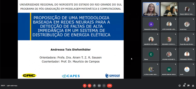 Na última semana, no dia 22 de junho, ocorreu o exame de qualificação da tese de doutorado da acadêmica Andressa Tais Diefenthäler no Programa de Pós-Graduação Stricto Sensu em Modelagem Matemática e Computacional da Unijuí. A pesquisa, denominada “Proposição de uma metodologia baseada em redes neurais para a detecção de faltas de alta impedância de um Sistema Distribuído de Energia Elétrica”, foi aprovada pela Comissão Examinadora para fins de prosseguimento.