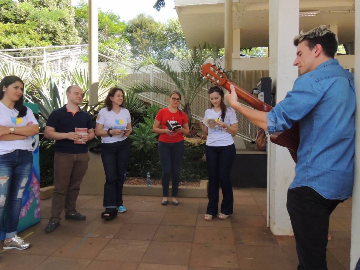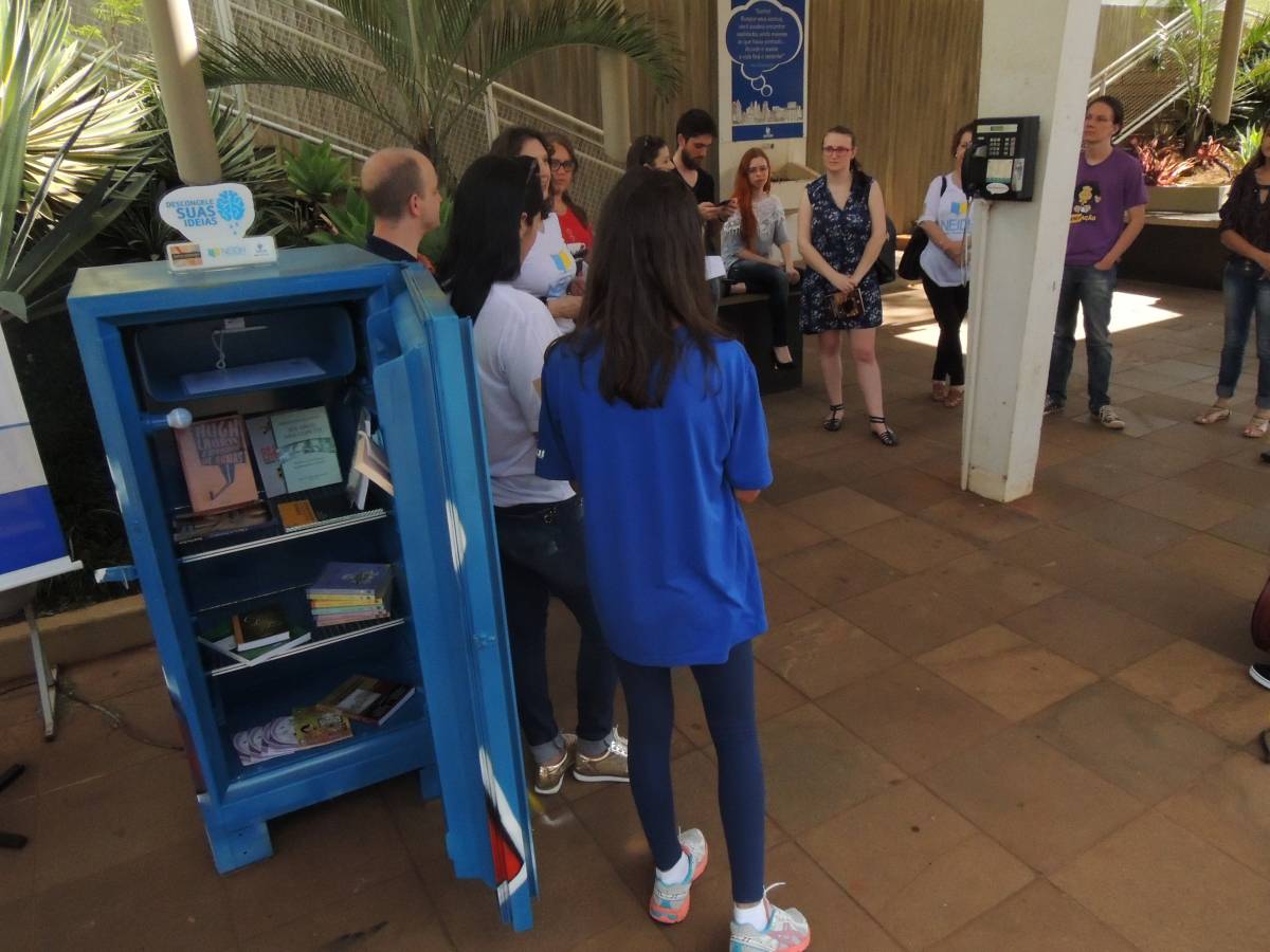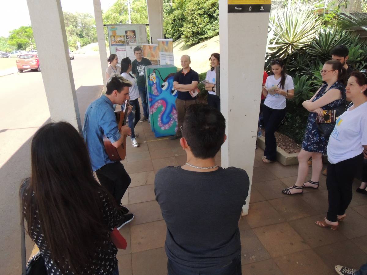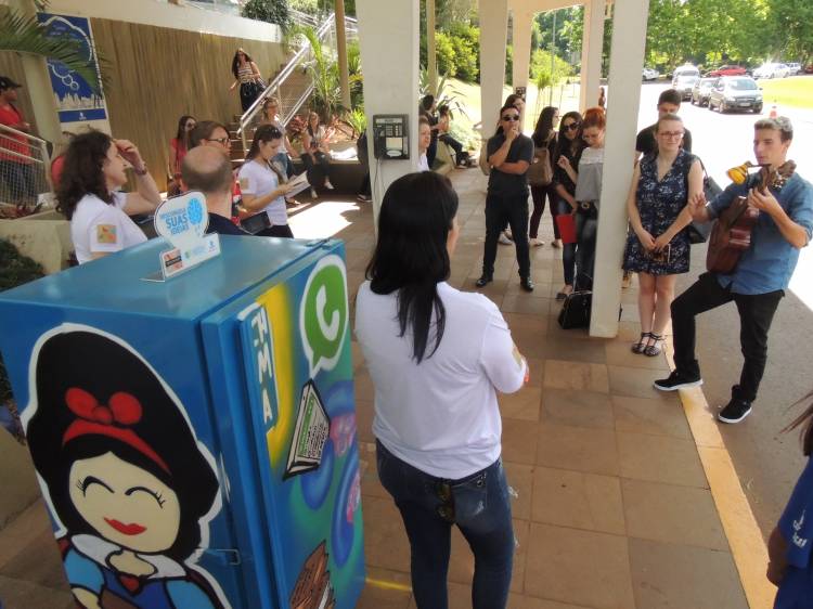 Música e literatura formam um par perfeito e combinam com a arte personalizada das quatro geladeirotecas do Projeto Descongele suas Ideias, da Unijuí. Na tarde desta quinta, 1º de dezembro, no campus Ijuí, uma roda de leitura ao som do violão do músico João Pedro Van Der Sand marcou o lançamento oficial do Projeto Descongele suas ideias, cujo primeiro passo foi dado no dia 16 de novembro com a grafitagem das quatro geladeirotecas, por Pedro Silva, de Passo Fundo. A comunidade ofereceu o seu apoio e agora as geladeiras estão recheadas com livros que foram disponibilizados ao público nesta quinta, durante a atividade interativa. O lançamento ocorreu na parada de ônibus em frente à Biblioteca Mário Osório Marques.