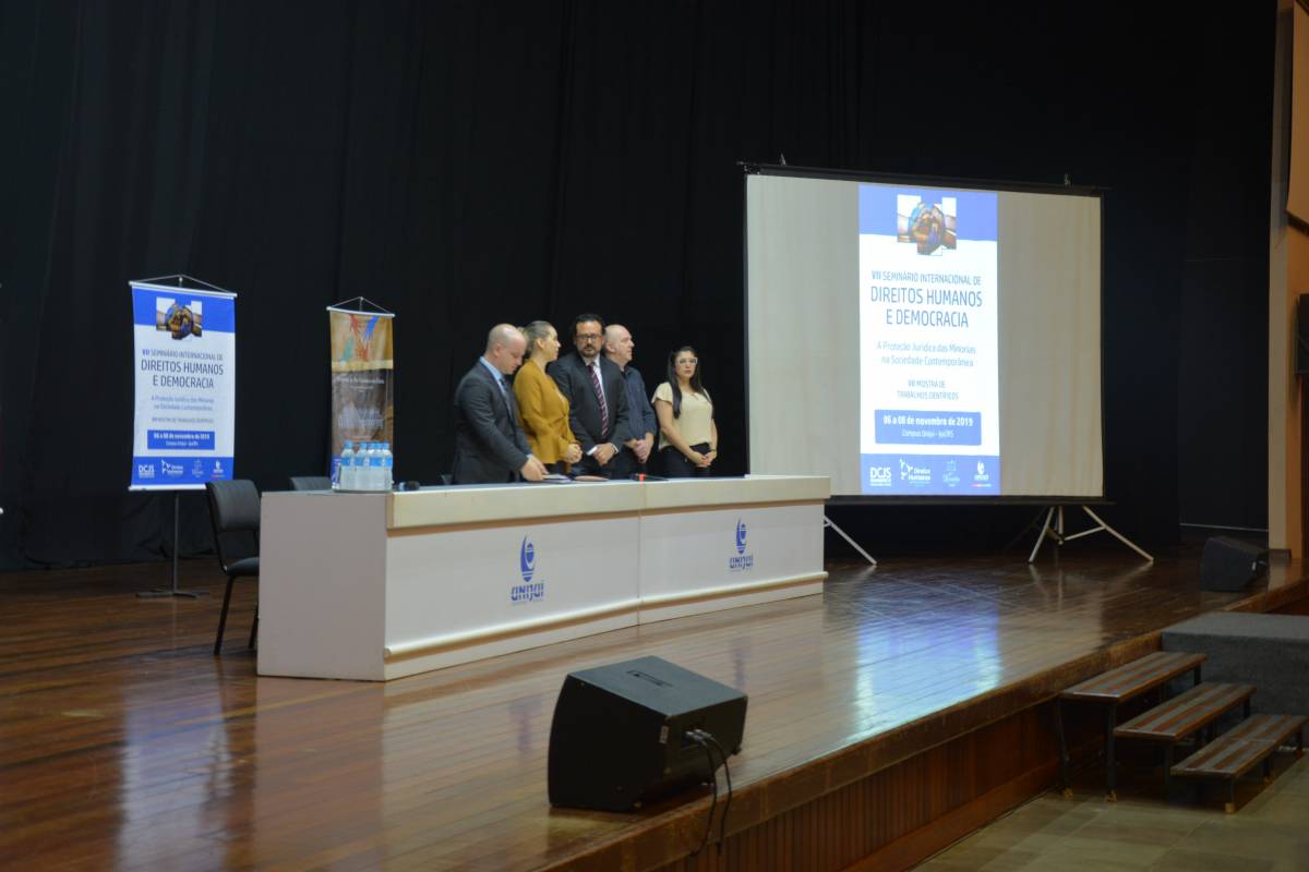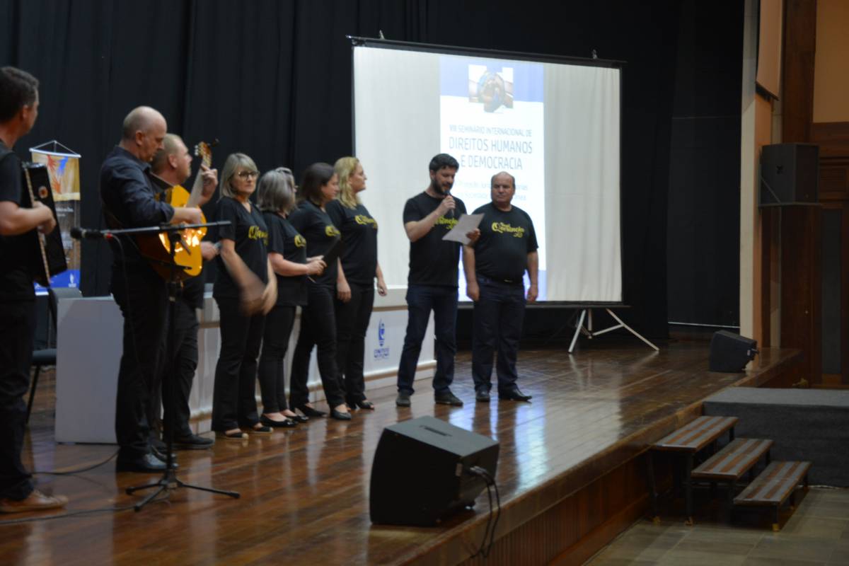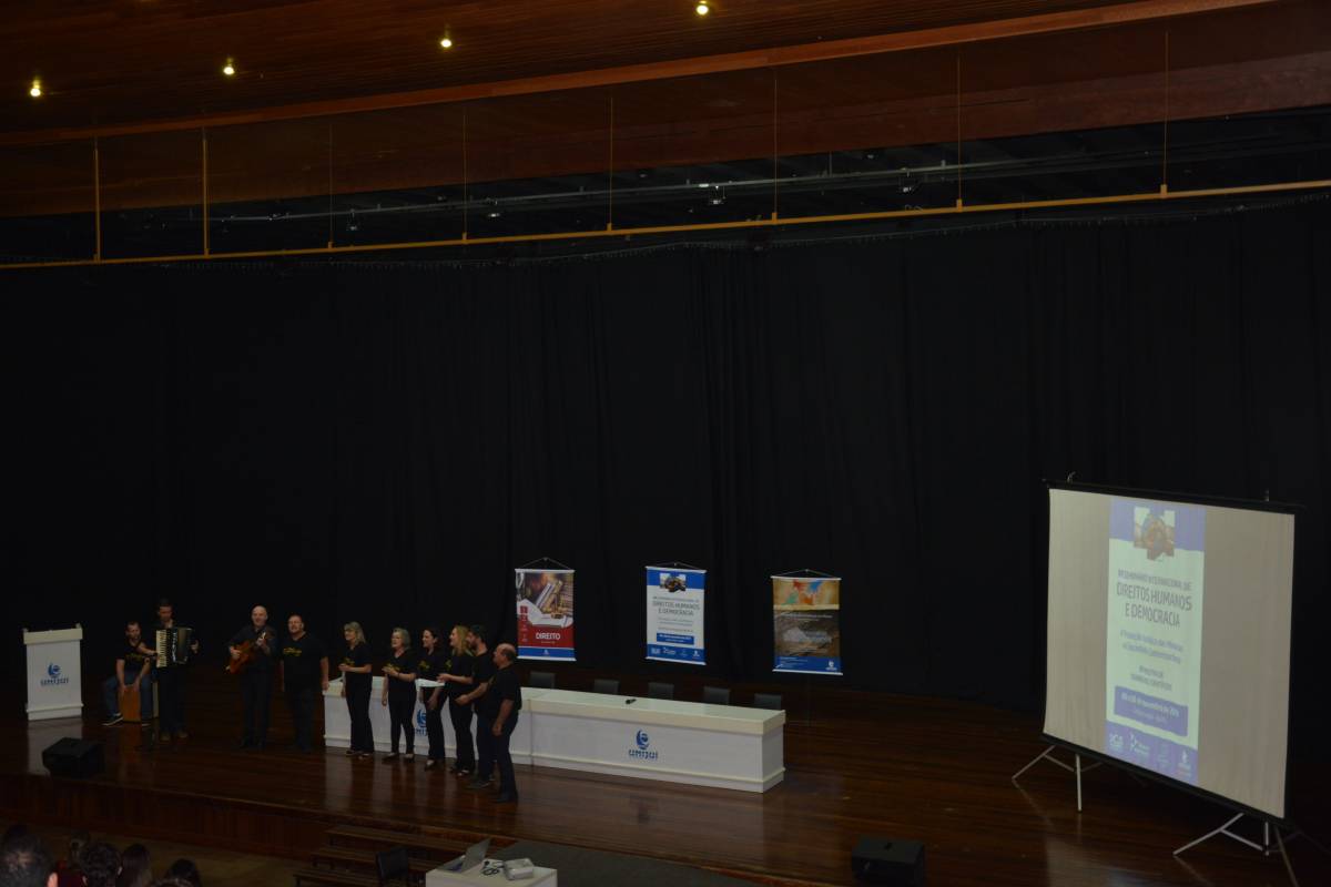 Com a proposta de discutir e investigar avanços, riscos e desafios na proteção jurídica do direito à diferença das minorias, o tema que abriu o VII Seminário Internacional de Direitos Humanos e Democracia foi “Muros, Medos e Esperança”, propondo uma reflexão sobre a afirmação dos direitos humanos e do direito à igualdade. Além do debate, a noite contou com a apresentação artística do Grupo Vocal Querência.