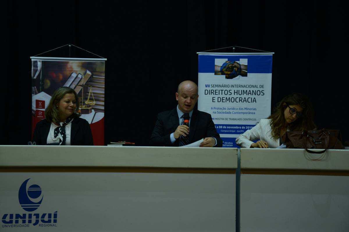 Compondo a mesa de autoridades, o professor coordenador do Programa de Pós-graduação Stricto Sensu em Direitos Humanos da Unijuí, Maiquel Ângelo Dezordi Wermuth, destacou a pertinência do tema do Seminário, intitulado “A Proteção Jurídica das Minorias na Sociedade Contemporânea”, observando: “nenhum corte de verbas, nenhuma ameaça infantil e irresponsável à democracia poderá nos deter, na medida em que, unidos sigamos, comprometidos fundamentalmente a não soltar, em hipótese nenhuma, a mão de ninguém”, disse.