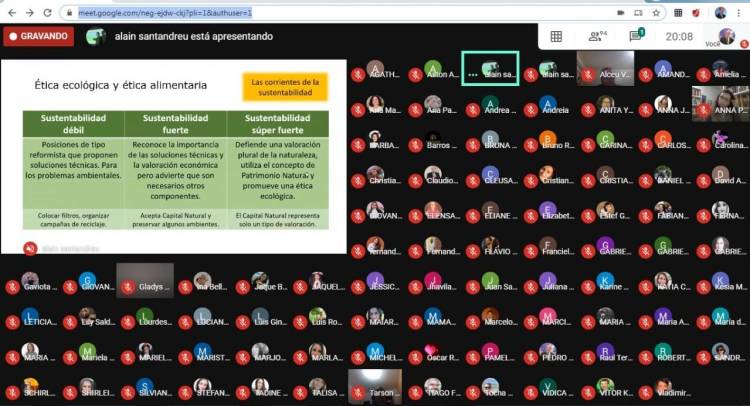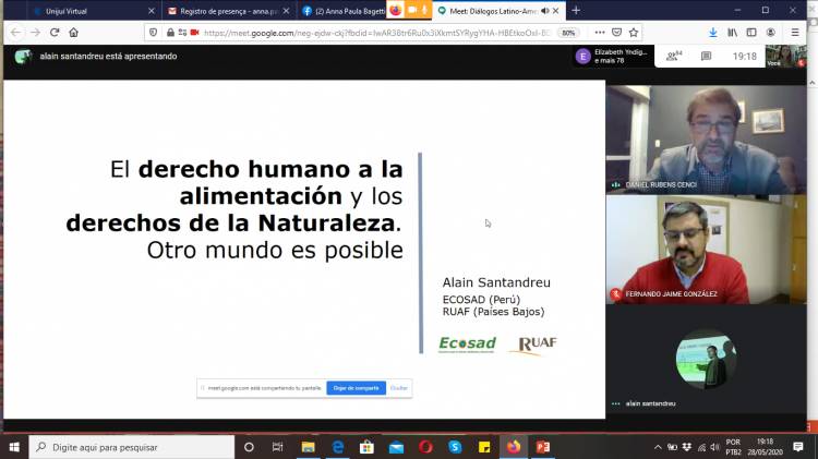 No dia 28 de maio de 2020, aconteceu mais uma edição do Diálogos Latino-Americanos, com o tema 'El Derecho Humano a la alimentación y los derechos de la naturaleza en el nuevo mundo', palestra proferida pelo Dr. Alain Santandreu - Presidente Ejecutivo ECOSAD – Consórcio por la Salud, Ambiente y Desarrollo e investigador associado a RUAF e membro da PAQ (Lima/Peru).