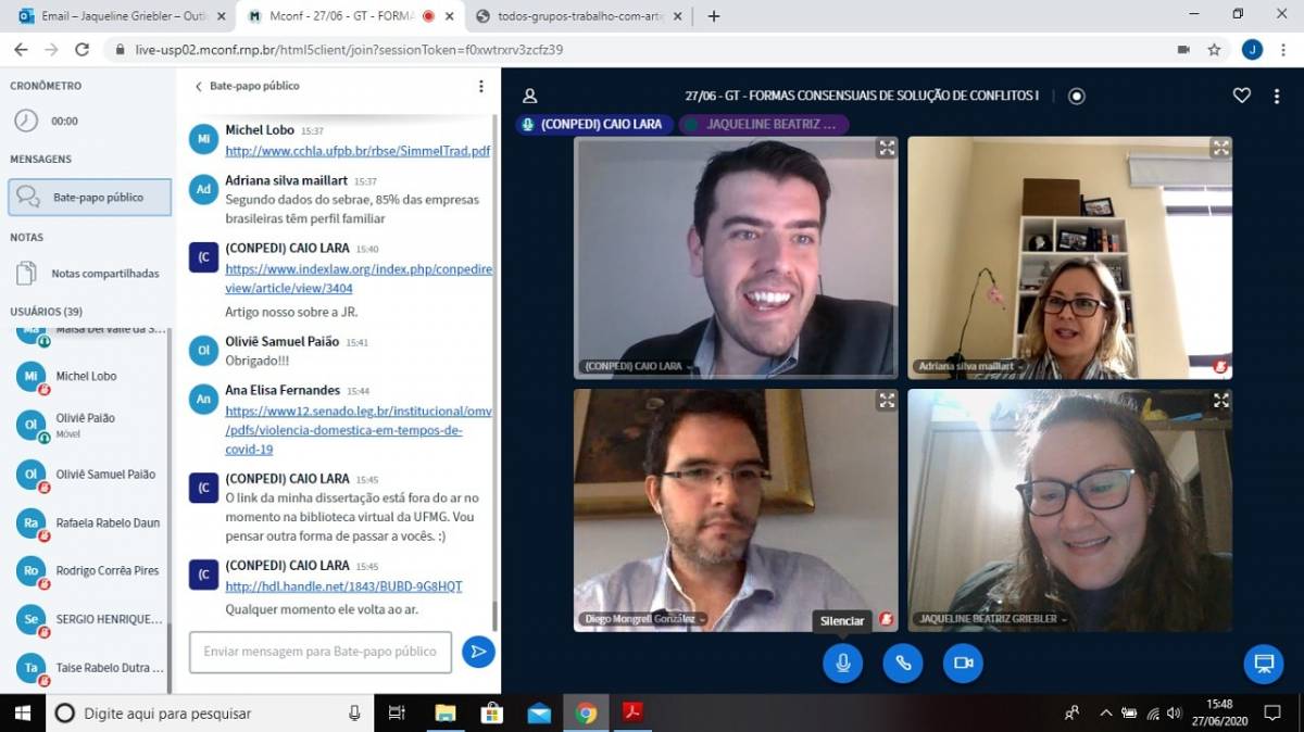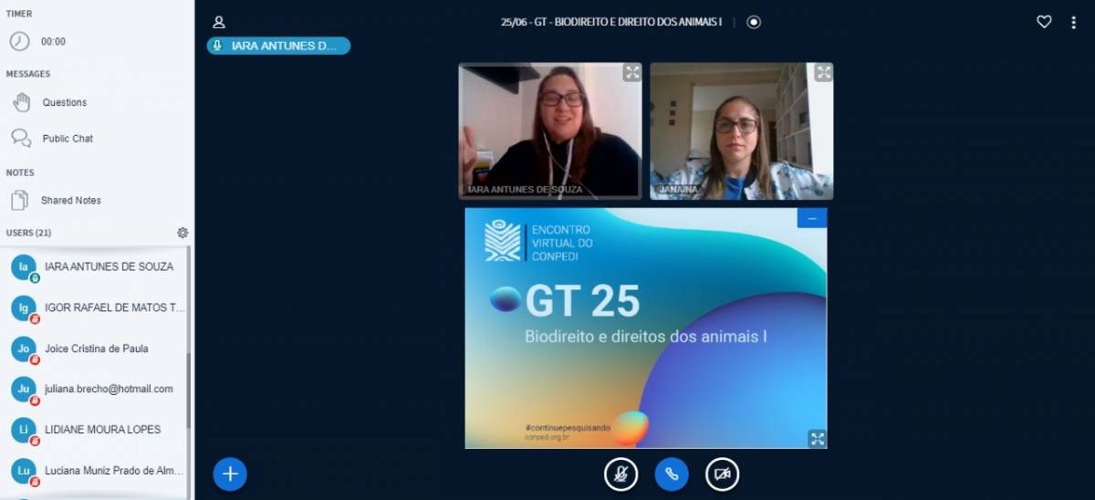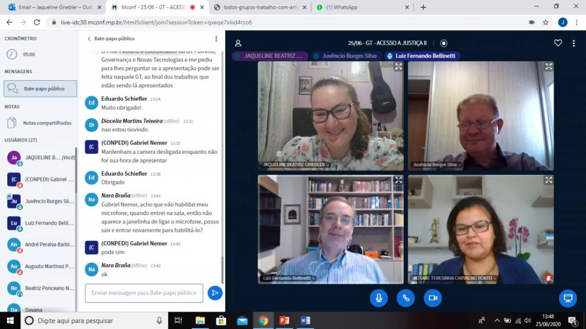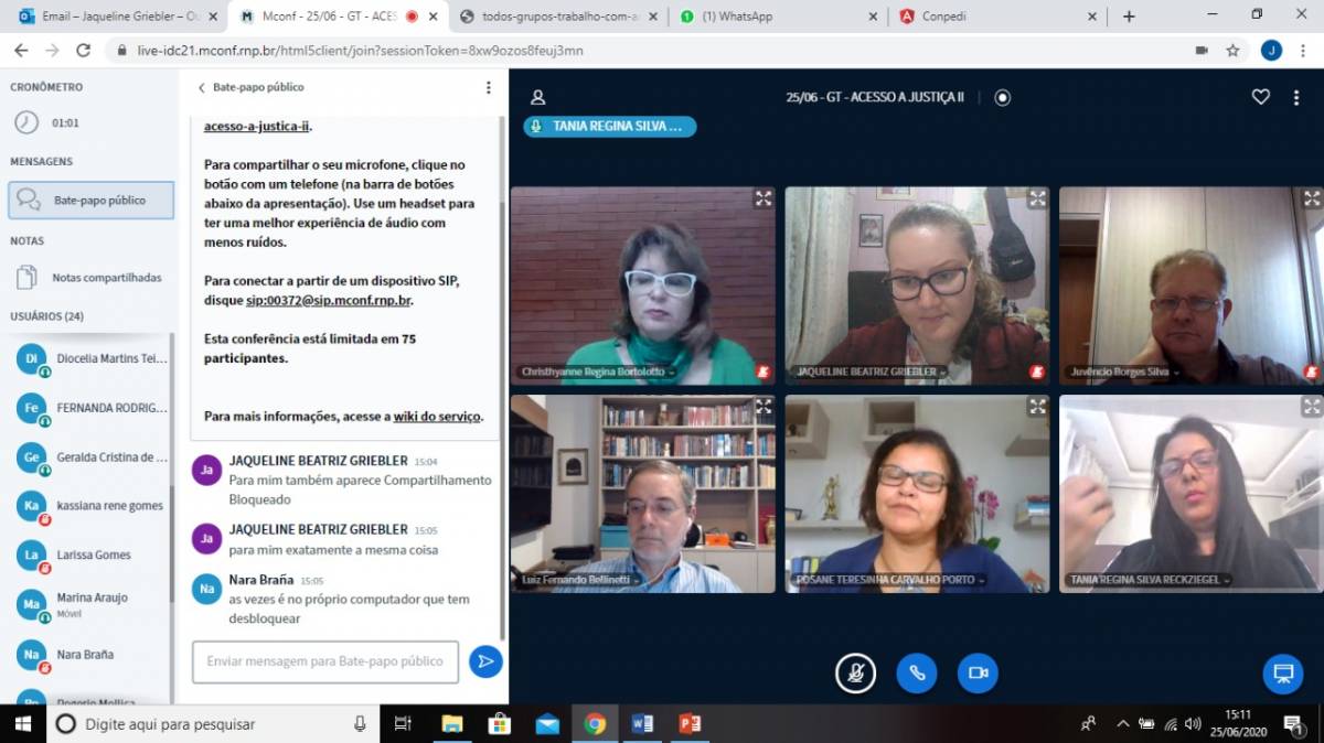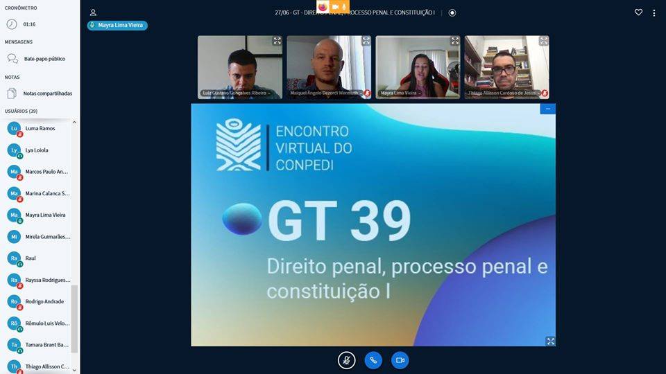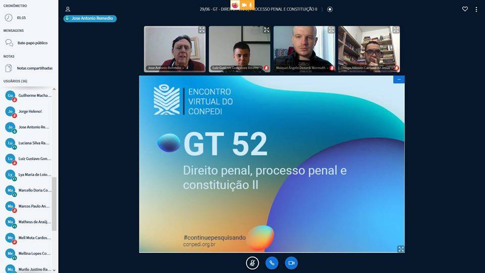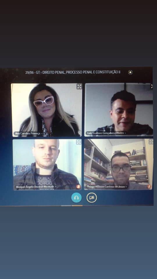 No que se refere à coordenação de GT´s, a Prof.ª. Drª. Janaína Machado Sturza foi responsável pela coordenação do GT 25 – Biodireito e Direito dos animais I, em 25 de junho de 2020. O Prof. Dr. Maiquel Ângelo Dezordi Wermuth coordenou o GT 39 – Direito Penal, Processo Penal e Constituição I, em 27 de junho de 2020, bem como o GT 52 - Direito Penal, Processo Penal e Constituição II, em 29 de junho de 2020.