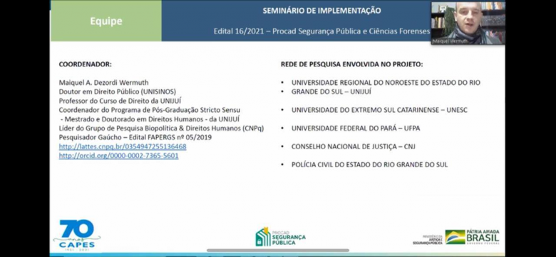 O professor Maiquel A. Dezordi Wermuth, do Programa de Pós-Graduação em Direito da Unijuí, participou, na última semana, do Seminário de Implantação do Programa de Cooperação Acadêmica (Procad), financiado pela Coordenação de Aperfeiçoamento de Pessoal de Nível Superior (Capes), na área de Segurança Pública e Ciências Forenses (Edital nº 16/2020).