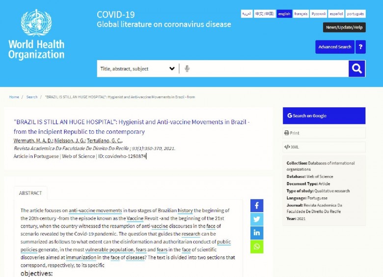 O texto “O Brasil ainda é um imenso hospital: movimentos higienistas e antivacina no Brasil – da incipiente República à contemporaneidade”, escrito pelos professores doutores da Unijuí em coautoria com a pesquisadora em Saúde Coletiva da Unisinos e coordenadora do Serviço de Vigilância Epidemiológica da Secretaria Municipal de Cachoeirinha, Gisele Cristina Tertuliano, passou a integrar o banco de dados.
