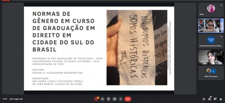 A programação teve início no mês de maio e contou com três palestras online: a primeira teve como tema “Imagens de controle e perversão do Direito”, com a doutoranda em Sociologia pelo Programa de Pós-Graduação em Sociologia da UFRGS, Winnie Bueno; e a segunda tratou do “Dispositivo amoroso e casa dos homens: o que não nos contam sobre amor e gênero”, realizada pela doutora em Psicologia pela Universidade de Brasília, Valeska Zanello. Na sexta-feira, o debate aconteceu em torno da temática “As normas de gênero do direito brasileiro”, a cargo da doutora em Direito, Política e Sociedade (UFSC) e em Psicologia, Grazielly Alessandra Baggenstoss.
