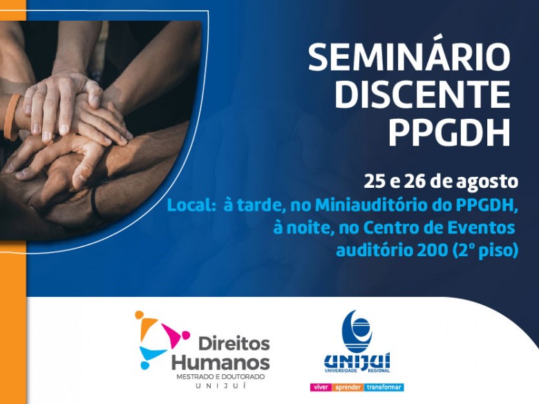 O Programa de Pós-Graduação Stricto Sensu em Direitos Humanos da Unijuí irá promover, nos dias 25 e 26 de agosto, o Seminário Discente PPGDH. Serão dois dias de intensa programação, que contará com palestras, debates, exposições e troca de experiências. O evento ocorrerá em dois locais: as atividades da tarde serão realizadas no Miniauditório do PPGDH, enquanto o Centro de Eventos sediará as palestras da noite.