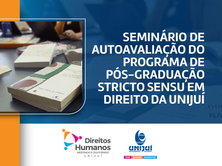 Na próxima sexta-feira, 21 de outubro, será realizado o Seminário de Autoavaliação do Programa de Pós-Graduação Stricto Sensu em Direito da Unijuí, junto ao auditório do PPGD. O evento é destinado aos professores do Programa, representantes discentes dos cursos de Mestrado e Doutorado e discentes das turmas 2019 e 2020 do curso de Doutorado.