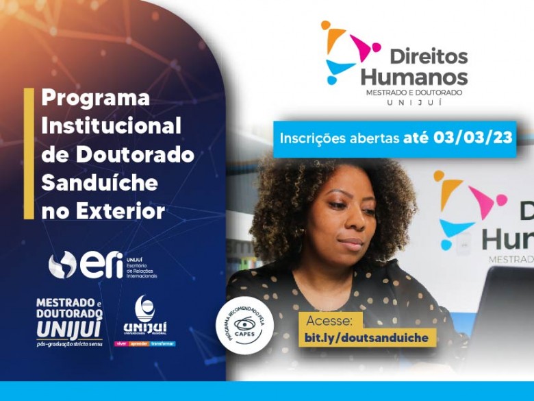 Está aberto o edital VRPGPE 002/2023 que prevê a oferta de vagas para estudantes de Direitos Humanos da Unijuí para o Programa Institucional de Doutorado Sanduíche no Exterior (PDSE/Capes). Estão sendo ofertadas duas bolsas de estudos, com duração de seis meses cada, totalizando 12 meses.