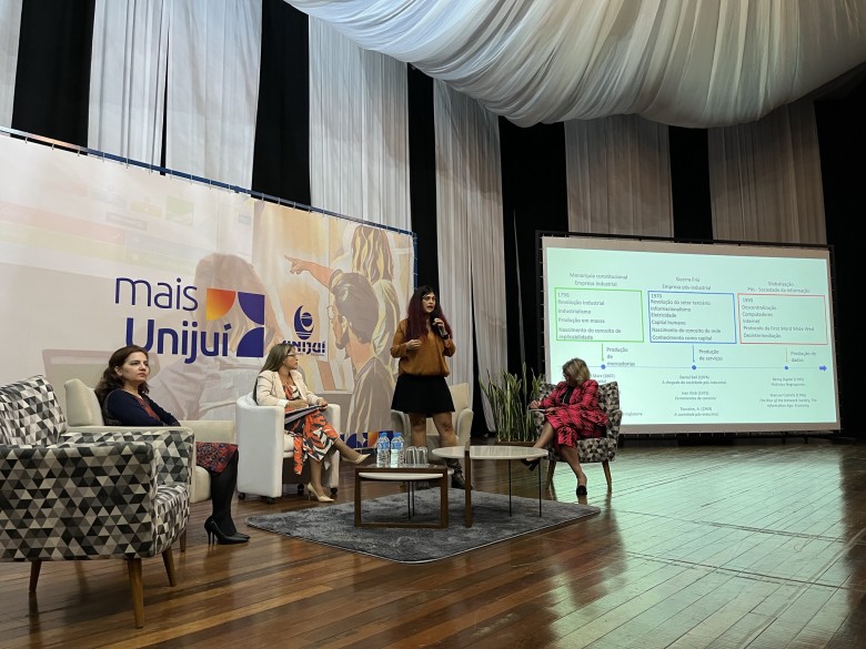Para discutir o tema “Teorias sociológicas e Inteligência Artificial”, foram convidadas Vanessa Russo, PhD em Ciências Sociais: aplicações de teorias e intervenções e pesquisadora no Departamento de Ciências Jurídicas e Sociais da Università degli Studi 'G. d'Annunzio' Chieti de Pescara, na Itália; Silvia Beatriz Lopes Safi, doutora em Direito pela Universidade Pablo de Olavide de Sevilha, na Espanha, pesquisadora e professora de pós-graduação na American University; e Sandra Regina Martini, doutora em Evoluzione dei Sistemi Giuridici e Nuovi Diritti pela Università degli Studi di Lecce e pós-doutora em Direito pela Università di Roma. Como mediadora, atuou a professora da Unijuí, Janaina Sturz.