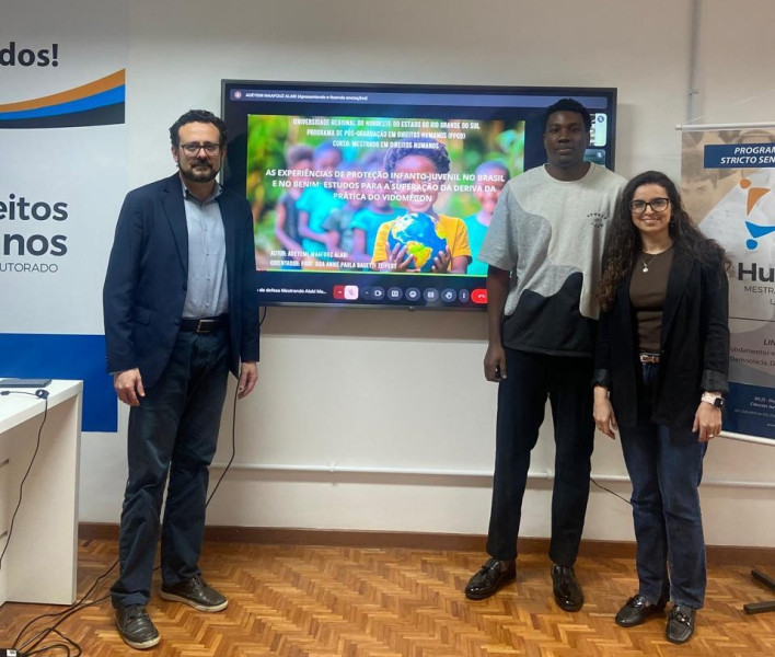 O mestrando do Programa de Pós-Graduação Stricto Sensu em Direito (PPGD) da Unijuí, Adeyemi Maafouz Alabi, fez a defesa de sua dissertação de mestrado na última semana. Natural de Benin, o estudante teve como tema “As experiências de proteção infanto-juvenil no Brasil e no Benim: estudos para a superação da prática do Vidomégon”, sendo orientado pela professora Anna Paula Bagetti Zeifert. A banca, além da orientadora, foi composta pelos docentes Doglas Cesar Lucas, da Unijuí, e Cleide Calgaro, do PPGD da Universidade de Caxias do Sul (UCS).