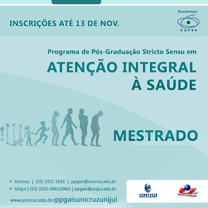O Programa de Pós-Graduação em Atenção Integral à Saúde, projeto interinstitucional executado em associação ampla entre a Universidade de Cruz Alta e a Universidade Regional do Noroeste do Estado do Rio Grande do Sul (Unijuí), publicou o edital de inscrições para provimento de vagas para o curso de Mestrado, com início previsto para 2016.