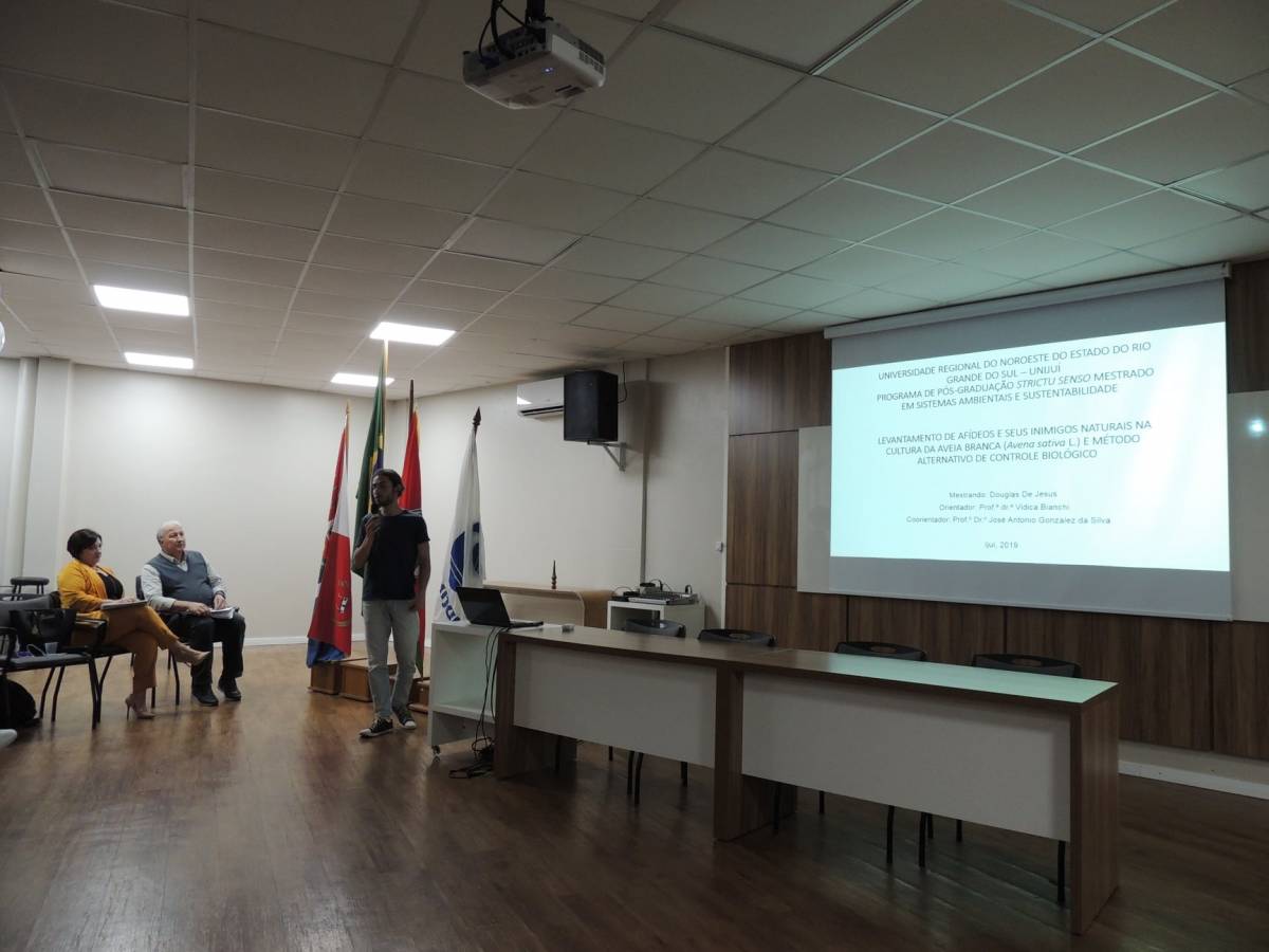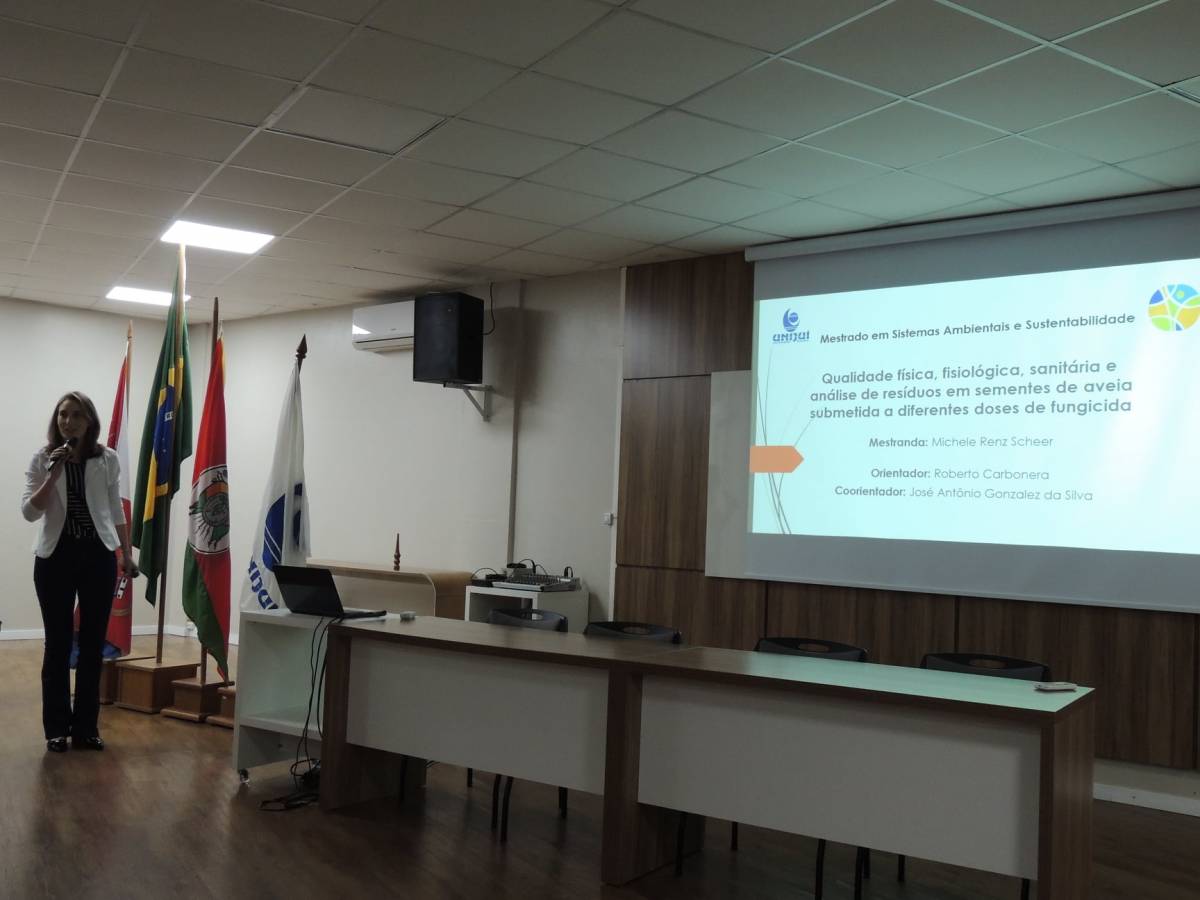 Foram apresentados os projetos dos seguintes alunos e alunas: Bióloga e professora Silviane Koch sobre a “Caracterização de um banhado urbano a partir do estudo da Qualidade da água e da riqueza da vegetação arbórea remanescente”; Engº Agrº,especialista em Nutrição Animal Agustinho Alcione Bottega, sobre “Sustentabilidade da pequena propriedade rural produtora de leite, com ordenha robotizada em galpão climatizado tipo free stall (estudo de caso); Biólogo, Douglas de Jesus “Levantamento de afídeos e seus inimigos naturais na cultura da aveia branca (Avena sativa L.) e método alternativo de controle biológico;Pedagoga e professora Eliane Marili Uhde “Estratégias de educação socioambiental para uma sociedade sustentável”; Advogada Fernanda Gewehr de Oliveira “Cidade Sustentável: processos de gestão municipal sob o viés da urbanização e do saneamento básico”; Arquiteta Jéssica Bronzatti Mello “O telhado verde como tecnologia sustentável na arquitetura”; Bióloga, ProfessoraJuliana Boniatti Libardoni Buratti “Avaliação e preservação de recurso hídrico a partir do uso de indicadores e bioindicadores de qualidade ambiental”;Administradora Marjorie Reis Müller “Análise da governança ambiental do Mercosul”; Química Michele Renz Scheer “Qualidade física, fisiológica, sanitária e análise de resíduos em sementes de aveia submetida a diferentes doses de fungicida” e Bióloga Laura Mensch Pereira “Avanços Científicos e Tecnológicos à Redução do uso de Fungicida em Aveia Branca via Parâmetros Genéticos e Modelos Biométricos”.