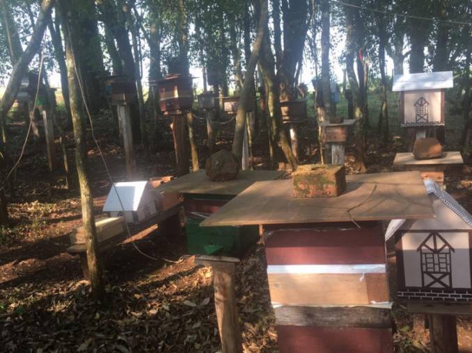 Ainda na parte da manhã, meu amigo Tiago me apresentou sua fazenda de abelhas com várias colmeias modernas com mais de 20 espécies de abelhas nativas sem ferrão. Com estas espécies de abelhas tive o privilégio de trabalhar com Tiago como parte de nosso sistema de pesquisa meio ambiente e sustentabilidade na Unijuí. O mais importante que retiro desta visita é que devemos sensibilizar a população para que conheçam bem esta espécie polinizadora, pois sem ela não terá plantas, sem plantas não terá alimento e sem alimento não terá vida, daí a importância de proteger as abelhas, porque são um verdadeiro escudo protetor para o equilíbrio do nosso ecossistema.