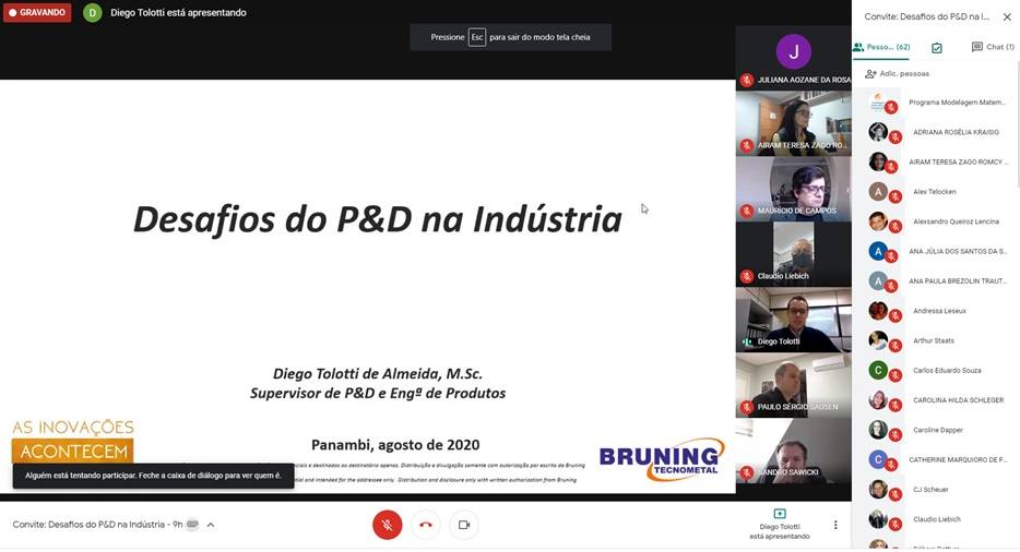 Na manhã do dia 1º de setembro, o Programa de Pós-Graduação em Modelagem Matemática e Computacional realizou o Webinar "Os Desafios do P&D na Indústria", com Diego Tolotti, que é Engenheiro Mecânico pela UNIJUÍ, mestre em Ciência e Tecnologia dos Materiais pela UFRGS, doutorando em Ciência e Tecnologia dos Materiais também pela UFRGS. Com mais de 17 anos de experiência na indústria metal-mecânica, atua como supervisor de Pesquisa e Desenvolvimento (P&D) e Engenharia de Produtos na BRUNING TECNOMETAL LTDA (Panambi-RS), na elaboração e desenvolvimento de projetos de pesquisa nas áreas de conformação, soldagem e análise de materiais, acompanhamento da realização de processos e testes práticos, que subsidiam o desenvolvimento de novas tecnologias.