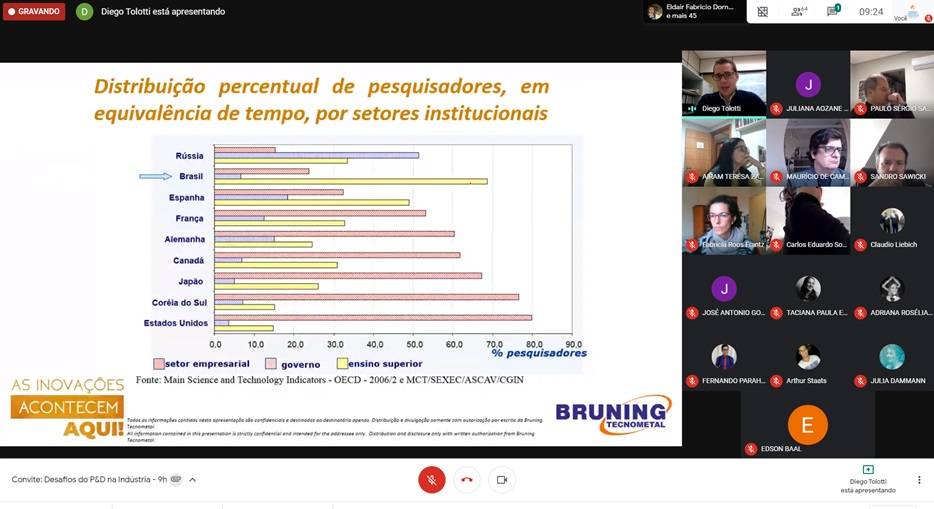 O palestrante Diego abordou sobre a importância de fazer ciência de qualidade através de projetos P&D dentro da empresa/indústria, com a colaboração da Universidade, pois é dessa interação que surgem as inovações, objetivando resolver os problemas da sociedade. Neste evento estiveram presentes os docentes, mestrandos e doutorandos do Programa em Modelagem Matemática e Computacional, docentes da Unijuí, e profissionais de várias empresas da região. Foi um momento importante de troca de conhecimento, na qual o palestrante após apresentar a estrutura de P&D da Bruning, dialogou com os demais participantes do evento respondendo os questionamentos sobre o tema em questão.