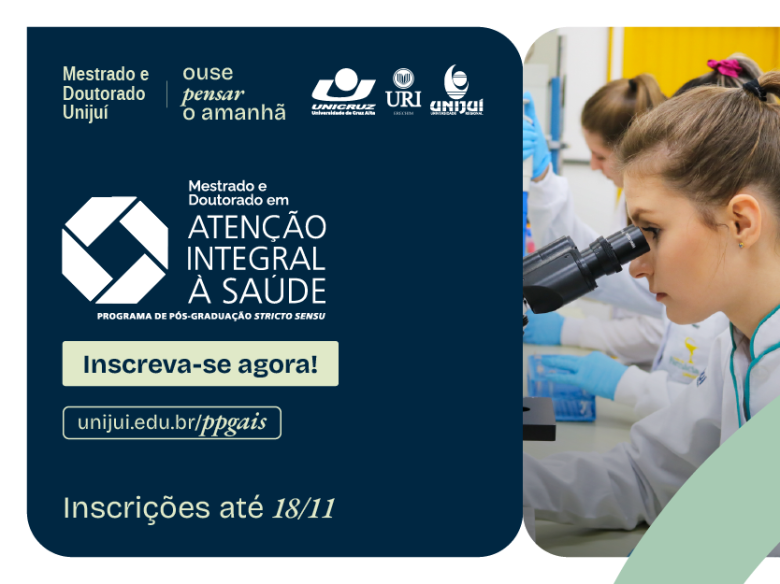 Podem se inscrever para os cursos candidatos formados na área da Saúde. O prazo encerra no dia 18 de novembro. Os editais bem como as inscrições podem ser feitas no site unijui.edu.br/ppgais.