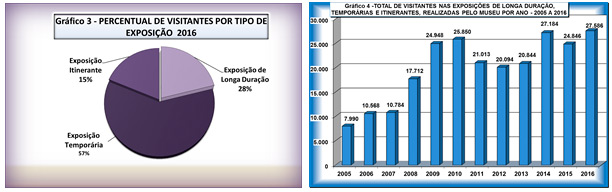 O Gráficos 3 apresenta o número de visitantes, nas exposições, por tipo de exposição e o Gráfico 4 o número de visitantes por ano.