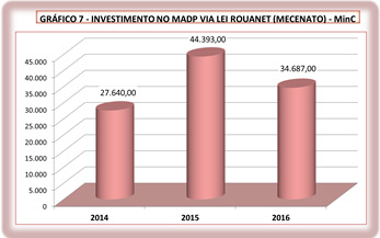 O Gráfico 7 mostra o valor captado nos anos de 2014 a 2016 para a execução do Projeto Revitalização do Sistema de Climatização do MADP.