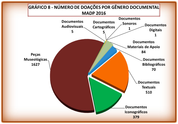 O Gráfico 8 mostra o número de doações por gênero documental que enriqueceram o acervo preservado pelo Museu.