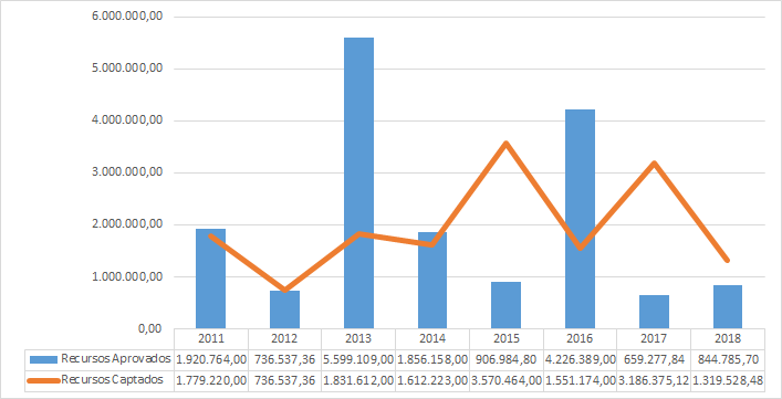 A projeção do orçamento de caixa e de financiamento com recursos externos possibilita a constituição de um fundo para investimentos. Para 2018 foram previstos investimentos equivalentes a 2,5% da Receita Operacional Bruta anual, no montante de, aproximadamente, R$ 3,7 milhões, conforme a meta estabelecida no Plano de Desenvolvimento Institucional (PDI) – Eixo 3 – Qualificação da Gestão. Para a realização dos investimentos são considerados os prazos de financiamento e pagamento das compras, bem como a capacidade de pagamento do fluxo de caixa. Também são avaliadas as possibilidades de contratação de linhas de créditos de investimento de longo prazo na condição de que sua tomada não altere a estrutura global de custos institucionais. No ano de 2018 foram investidos R$ 4.977.069,54, o que corresponde a 3,7% da receita total anual, em infraestrutura, incluindo reformas para qualificação de espaços, equipamentos de informática e de laboratório, móveis e equipamentos em geral, climatização, veículos, dentre outros.