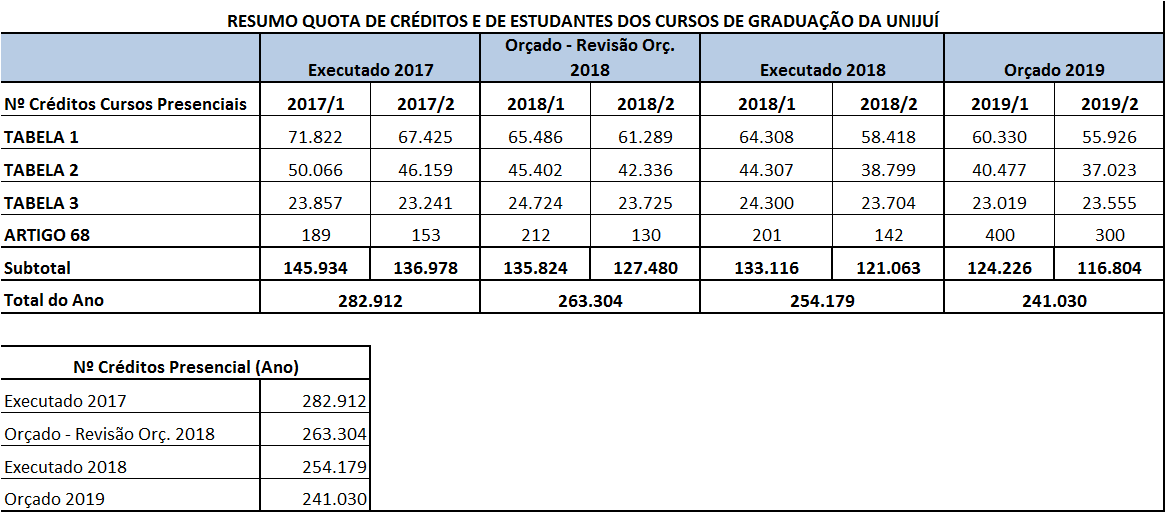 Na cota de créditos da revisão orçamentária para o ano de 2018, foram projetados 263.304 créditos (135.824 no primeiro semestre e 127.480 no segundo semestre). O Quadro a seguir apresenta a cota de créditos executada em 2017, a cota de créditos projetada e executada em 2018, bem como a projeção para 2019.