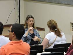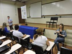Cleonice teve o auxílio da intérprete Ana Schmidt e acompanhou atentamente a explanação dos trabalhos apresentados durante a noite da terça-feira, 30. “É riquíssimo o aprendizado desta noite, pois saímos um pouco da teoria e partimos para a prática, o que também me auxiliará no meu Trabalho de Conclusão de Curso”, afirmou a acadêmica.