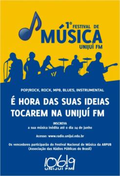 Diferente da maioria dos festivais de música tradicionais, o objetivo principal deste projeto é abrir espaço na programação das rádios públicas, educativas e universitárias brasileiras para a nova produção musical das cinco regiões do país. Aderindo à proposta, a UNIJUÍ FM realiza este ano o 1º Festival de Música da Rádio UNIJUÍ FM. Oportunidade para garantir a participação no concurso nacional organizado pela Arpub.