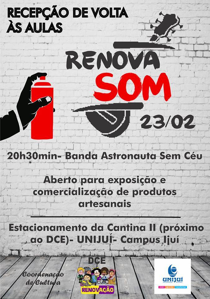 Nesta terça-feira, o Diretório Central de Estudantes (DCE) da Unijuí, promove evento de volta às aulas aos estudantes, no Câmpus Ijuí. O evento, que ganhou o nome de "Renovasom" tem a finalidade de dar espaço às bandas independentes de Ijuí e região para que mostrem seu som! O show é da banda santo-angelense Astronauta Sem Céu.