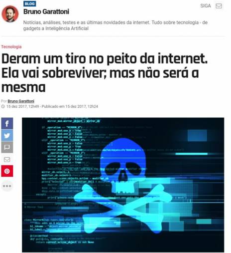 "Como você talvez saiba, ontem a Federal Communications Commission, a Anatel dos EUA, decidiu acabar com a chamada “neutralidade da rede”: princípio que obrigava os provedores de internet a tratarem igualmente todos os dados, sem poder discriminar ou privilegiar nada do que passa por suas redes. Os deputados e senadores americanos, que trabalharam a favor da medida, receberam mais de US$ 100 milhões em doações das empresas de telecomunicações, as grandes beneficiadas dessa história (não é só no Brasil, veja você, que corporações compram as graças dos políticos). O fim da neutralidade é a maior mudança da história da internet – que, ao longo dos próximos anos, poderá se transformar em algo radicalmente diferente. E não para melhor."