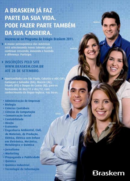 Acesse www.braskem.com.br e confira os detalhes do Programa de Estágio Braskem 2011. As inscrições vão até o dia 28 de setembro.