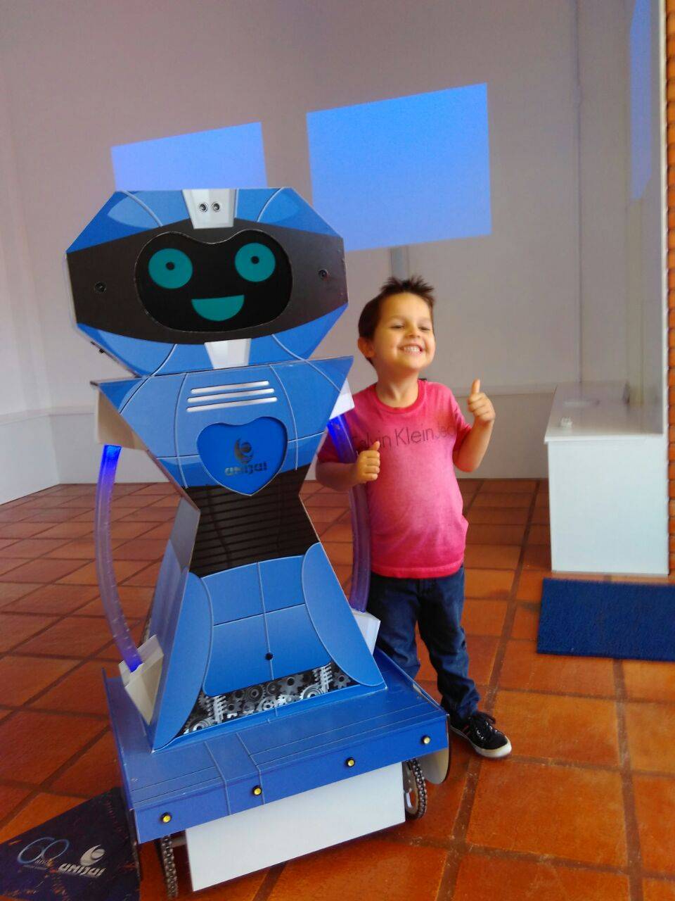 Maurício explica como funciona o robô, que tecnicamente são dois: “Ele está em um corpo só, mas a cabeça se comporta como um robô que reconhece face e começa um diálogo unilateral com algumas frases prontas até que a pessoa se afasta e ele se despede dela, e a base é um drone terrestre que faz com que ele de movimente ao longo da feira”.
