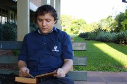 É hora do intervalo, por volta das 18h30min. As pessoas caminham pelo câmpus, conversam, algumas estão com os olhos fixos em seus smartphones, mergulhando em redes sociais e conversas por aplicativos. Sentado em um dos bancos em frente à Biblioteca do Câmpus Ijuí, o egresso e atualmente técnico-administrativo da Universidade Giovano Pereira Buratti lê. Café e livro a tiracolo. Conversamos com ele pra tentar sacar este hábito praticamente cotidiano entre um turno de trabalho e outro, levando em conta a pesquisa de Naomi S. Baron. Leitor de Pablo Neruda, Vladimir Maiakovski e Charles Baudelaire, entre outros, ele topou a conversa. Confira!