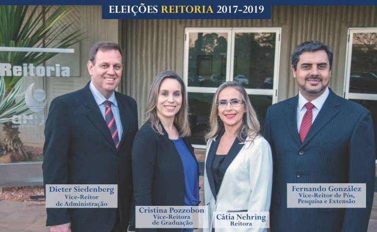 No dia 27 de outubro acontece a votação para a escolha da Reitoria da Unijuí para o mandato que vai de 13/12/2016 a 12/12/2019. A chapa que protocolou e teve sua candidatura homologada é composta pelos seguintes membros: Reitora, Cátia Maria Nehring, Vice-Reitora de Graduação, Cristina Eliza Pozzobon, Vice-Reitor de Pós-Graduação, Pesquisa e Extensão, Fernando Jaime González e o Vice-Reitor de Administração, Dieter Rugard Siedemberg.