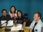 Foto: Os alunos Fábio Petry, Luana da Costa e Geanderson da Rosa, com a professora Vera Raddatz, além da acadêmica Larissa Freitas, produzem o programa