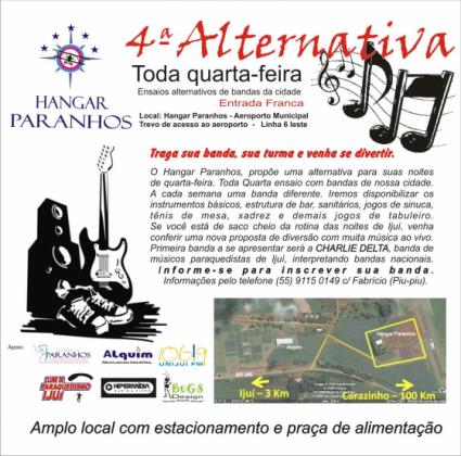 A cada semana uma banda diferente vai mostrar seu trabalho. Hoje é a vez da Charlie Delta, banda de músicos paraquedistas de Ijuí, que vai interpretar músicas de bandas nacionais. Para quem for conferir a 4ª Alternativa, toda a estrutura de lazer do Hangar vai estar disponível: sanitários, bar, jogos de sinuca, tênis de mesa, xadrez e demais jogos de tabuleiro.