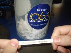A UNIJUÍ FM recebeu na manhã de hoje o integrante do Movimento Pró-Cinema em Ijuí, Charles Luchese, para a realização ao vivo do sorteio de uma camiseta. A divulgação aconteceu durante a programação do Direção e Arte. Durante toda a última semana, quem participou pelas redes sociais compatilhando a foto em apoio à instalação de uma sala de cinema no município, concorreu ao prêmio. Das 361 pessoas que compartilharam a foto do perfil da UNIJUÍ FM e do Movimento Pró-Cinema, a contemplada foi Odila Assmann Marinho. Ela pode retirar a camiseta na Prefeitura Municipal, entidade que apoia o movimento. Charles Luchese, que representa a ACI, resgatou a implantação do Movimento em Ijuí, falou sobre a campanha nas redes sociais e falou sobre os próximos passos para a viabilização da sala de cinema no município. Confira a galeria de fotos do sorteio ao vivo: |