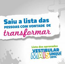 A UNIJUÍ divulgou nesta terça-feira a lista dos aprovados no Vestibular Mais 2014, que teve prova aplicada no domingo, dia 02. As matrículas iniciam nesta quarta-feira, 05, e se estendem até o dia 12 de fevereiro. Os classificados devem estar atentos ao calendário de matrículas (entregue no dia da prova) e a lista de documentos necessários para a sua efetivação, ambos disponíveis no Portal. As aulas têm início no dia 17 de fevereiro. Os cursos mais procurados no Vestibular Mais foram Engenharia Elétrica (Câmpus Ijuí); Direito (Câmpus Três Passos); Engenharia Elétrica (Câmpus Santa Rosa); Psicologia (Câmpus Santa Rosa); e Administração (Câmpus Ijuí). As melhores médias na redação da UNIJUÍ foram obtidas por candidatos dos cursos de Gestão Comercial (Tecnologia EaD), Matemática (Licenciatura Ijuí) e Letras: Português e Inglês (Ijuí). Já os cursos com as melhores médias na redação do Enem foram Comunicação Social – Jornalismo (Ijuí); Direito (Câmpus Três Passos) e Letras: Português e Inglês (Ijuí). Matrículas As matrículas iniciam nesta quarta-feira, 05 de fevereiro, e os candidatos devem trazer: original ou cópia autenticada do Histórico Escolar do Ensino Médio com Certificado de Conclusão; cópia da Certidão de Nascimento ou Casamento; cópia da Cédula de Identidade; cópia do Cadastro de Pessoas Físicas – CPF; cópia do Título Eleitoral e Certidão de Quitação Eleitoral; cópia do Certificado de Reservista; uma fotografia 3 x 4; comprovante de residência; atestado de Aptidão Física, para os classificados no curso de Educação Física; contrato de fiança para alunos que optarem pela Modalidade de Pagamento Estendido, assinado pelo fiador e por duas testemunhas, com cópia do CPF e do comprovante de residência do fiador e, no caso de alunos menores de 18 anos, com a assinatura do representante legal; para os cursos de Enfermagem, Farmácia, Fisioterapia e Nutrição deve ser apresentada cópia da Carteira de Vacinação. |