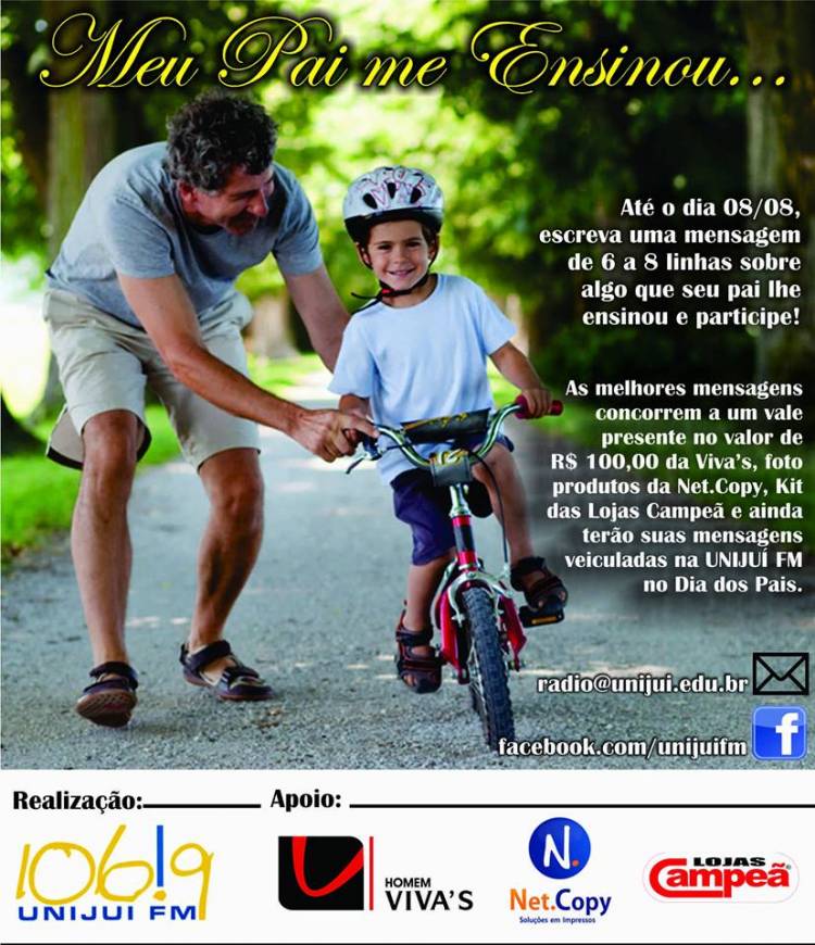 Foram divulgadas nesta Sexta-feira os vencedores da Promoção Meu Pai me Ensinou, da Unijuí FM. Os ouvintes puderam participar enviando suas mensagens que destacavam os ensinamentos repassados pelos Pais. As participações se deram pelo Facebook e pelo email da rádio. Uma comissão julgadora se reuniu e escolheu as melhores mensagens. Os quatro primeiros colocados receberam prêmios e as três melhores mensagens serão divulgadas na programação da Unijuí FM de domingo. Andréia Schimanowski Wizbicki foi contemplada com um Vale Presente da Vivas Moda Homem, Kaua Silva levou um Presente das Lojas Campeã, Tati Silva e Ana Louíse Diel foram contempladas com uma Foto Produto cada, gentileza da Net Copy. Confira abaixo as mensagens vencedoras. Mensagem de Andréia Schimanowski Wizbicki: “Meu pai me ensinou a ser uma pessoa de caráter, a ser uma pessoa honesta, a dar valor a aquilo que eu tenho, mas não desistir e lutar pelo que eu quero, me ensinou que mesmo na dificuldade não se deve desanimar, como ele mesmo diz tudo na vida tem seu tempo certo, me ensinou a aproveitar as coisas simples da vida, como um domingo em família, por exemplo, me mostrou que os valores adquiridos com a educação que recebemos em casa são a maior e melhor herança que recebemos dos nossos pais, pois é graças a isso e as nossas escolhas que somos quem somos. Por isso posso dizer com muito orgulho que tenho o melhor pai do mundo.” Mensagem de Kaua Silva: “Meu pai.. me ensinou a ser forte, a manter a cabeça erguida, me protegeu quando eu precisei, mas me deixou resolver os meus problemas quando eu lhe pedi, estava sempre ao meu lado, mas brigava comigo quando eu estava errado sem perder o carinho e a compreensão. Pai além te ajudar a te colocar no mundo, também é amigo, conselheiro, é tudo… É alguém que te ama,e é carinhoso.Obrigado por tudo pai!” Mensagem de Tati Silva: Já no meio do caminho aprendi a acreditar naquilo que faço lembrando a figura de meu pai, aquele que acima de tudo me incentivou, valorizou meu trabalho e me tornou consciente das minhas responsabilidades simplesmente por me passar a segurança de que ele acreditava em mim. Feliz dia dos pais em especial ao meu que esta morando lá no céu com DEUS.. Mensagem de Ana Louíse Diel: “Pai, 3 letras que definem um grande homem em nossas vidas. Certamente muito mais importante do que o que vamos conseguir descrever em apenas algumas linhas. Não diretamente relacionado, mas sinônimo de amigo, de companheiro, de parceiro, de confidente, de SEGURANÇA. Não tem dia, não tem hora, não tem tempo ruim. Pai pode talvez nem sempre estar presente fisicamente, mas de qualquer modo, almeja sempre o melhor por seus filhos. O meu é assim, e neste momento a ele especialmente, que está lá no interior de Santo Cristo sempre na lida pelo melhor pra sua Família, queria eu que por um descuido, Deus te fizesse ETERNO! O teu caráter é o meu exemplo, sempre! Ao pensar em Orgulho, é a sua imagem que me vem a cabeça. Grande coração, maneira simples de viver”