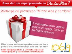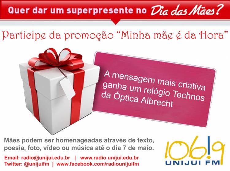 O Dia das Mães está chegando e a Rádio Educativa UNIJUÍ FM lança a promoção “Minha mãe é da Hora”. Referência em ações promocionais realizadas em datas comemorativas, a emissora tem agora o patrocínio da Óptica Albrecht. Buscando a interatividade com o público ouvinte, principalmente através das redes sociais, a UNIJUÍ FM irá premiar com um relógio Technos dourado, o autor da homenagem mais criativa. As mães poderão ser homenageadas através de mensagem de texto, poesia, foto, vídeo ou música até o dia 7 de maio.Uma comissão julgadora estará reunida no dia 8 para eleger o vencedor seguindo os critérios de originalidade, criatividade, emoção e conteúdo da mensagem. No dia 9 de maio, às 15h, durante a programação do Eletro Onda, será divulgado o resultado da promoção.