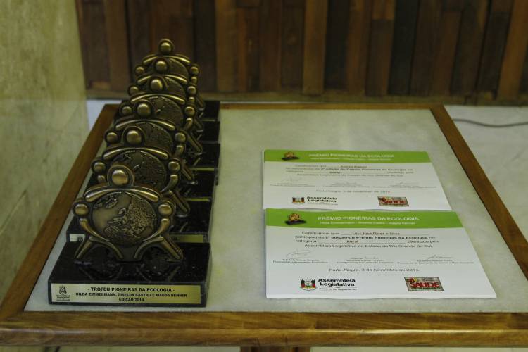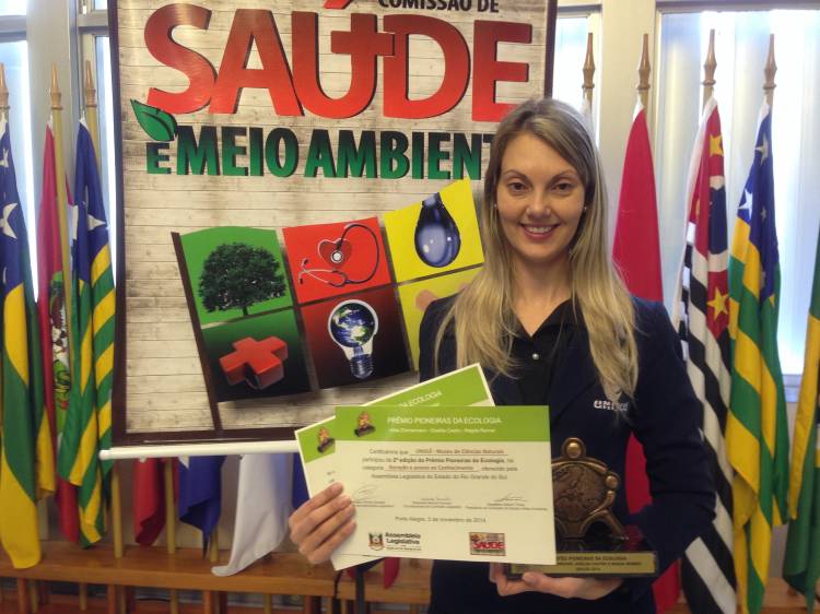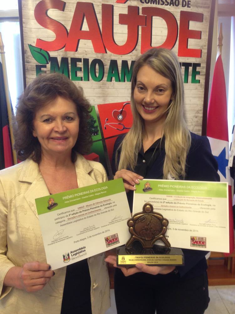 A UNIJUÍ FM, mantida da FIDENE/UNIJUÍ, recebeu ontem em Porto Alegre o Troféu Pioneiras da Ecologia – Hilda Zimmermann, Giselda Castro e Magda Renner. O projeto “O Rádio como agente transformador” foi reconhecido por usar o meio de comunicação para ensinar educação ambiental e ações sustentáveis a alunos do Ensino Fundamental. A solenidade de premiação, que ocorreu na Assembleia Legislativa do Estado do Rio Grande do Sul, também entregou o certificado de participação à UNIJUÍ por outro projeto inscrito, “Museu de Ciências Naturais”, sobre a exposição Conhecer para Preservar.