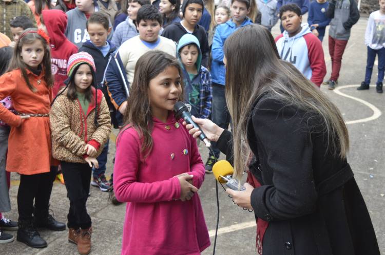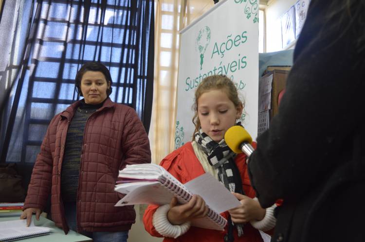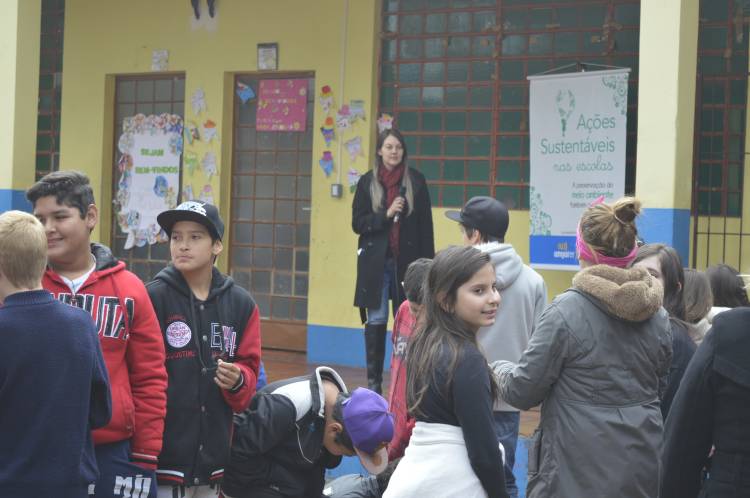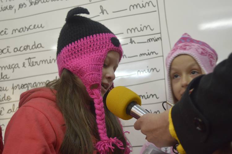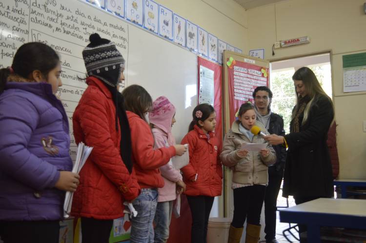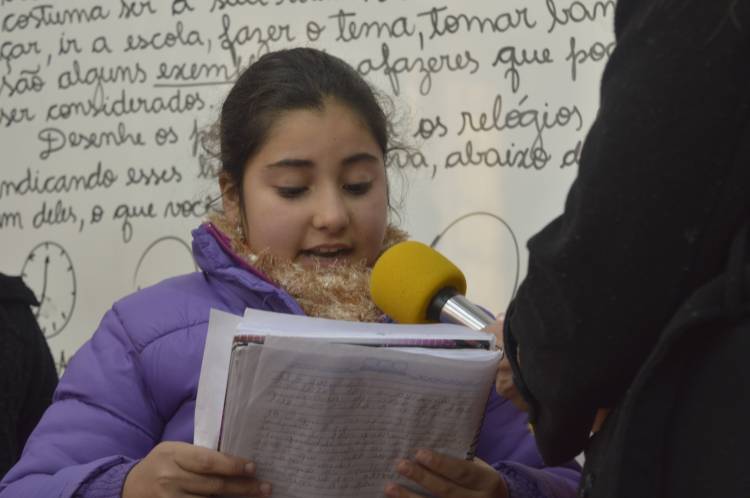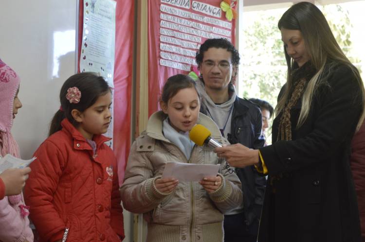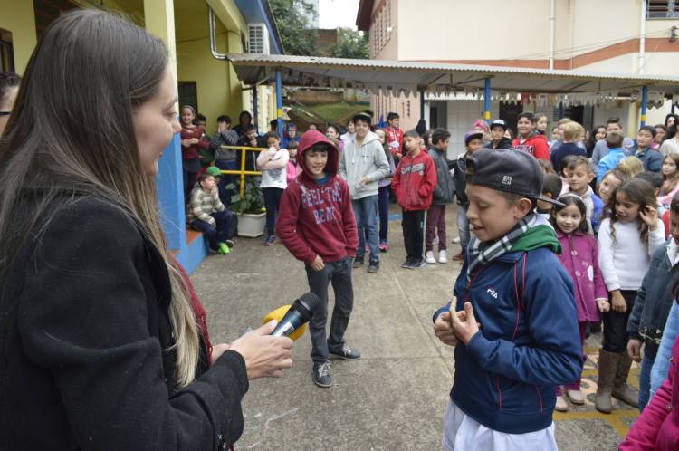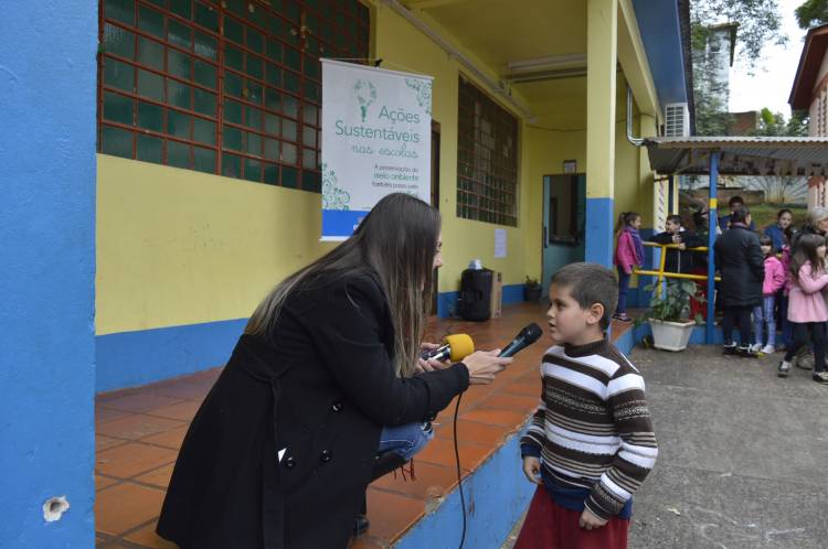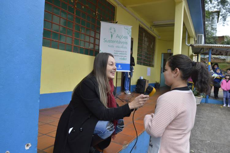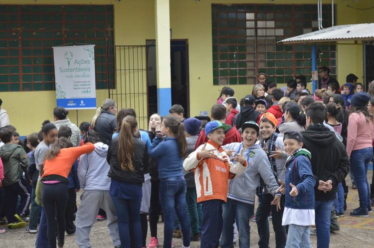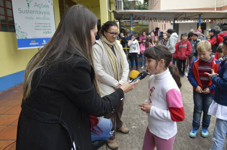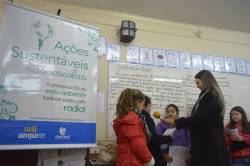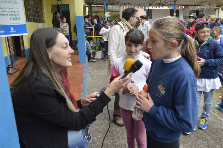 Na Escola São Geraldo, 220 alunos do 1º ao 7º foram reunidos no pátio, local onde ocorreu a dinâmica: falas no microfone, lembranças do conteúdo veiculado no rádio e dicas para a preservação do meio ambiente.