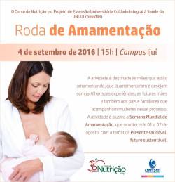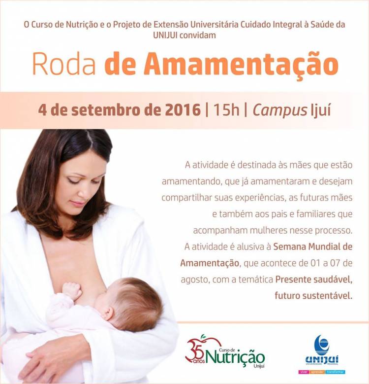 O Curso de Nutrição e o Projeto de Extensão Universitária Cuidado Integral à Saúde da UNIJUI realizam neste domingo, 4 de setembro, às 15h, uma Roda de Amamentação. A atividade é destinada às mães que estão amamentando, que já amamentaram e desejam compartilhar suas experiências, às futuras mães e também aos pais e familiares que acompanham as mulheres neste processo.