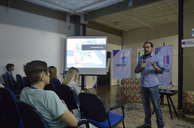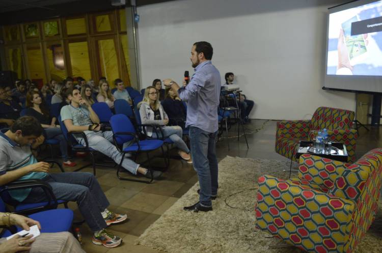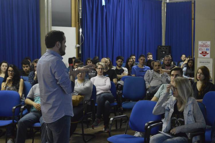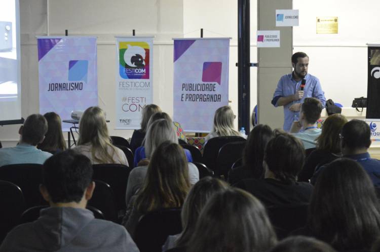Encerrando o FESTICOM 2016, acadêmicos dos cursos de Jornalismo e Comunicação Social habilitação em Publicidade e Propaganda receberam o jornalista Marcus Staudt para a palestra "Fuga de Padrão, sem perder a noção". Ele é editor chefe da TV Univates, apresentador do programa esportivo do canal do Centro Universitário Univates e coordenador de Rede Prosa, a rede das TVs e Rádios Univesitárias ligadas ao Consórcio das Universidades Comunitárias Gaúchas (COMUNG).