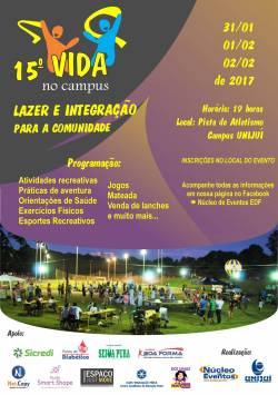 Nos dias 31 de janeiro e 01 e 02 de fevereiro, a partir das 19h, na pista de atletismo do campus Ijuí, será realizada a 15ª edição do Vida no Campus. Este ano o evento apresenta uma proposta diferenciada: as tradicionais modalidades competitivas vão dar lugar às práticas corporais.
