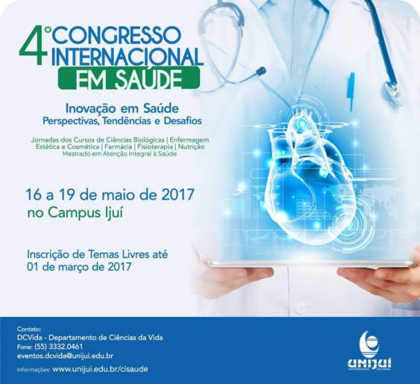 Com o tema Inovação em Saúde: Perspectivas, Tendências e Desafios, o 4º Congresso Internacional em Saúde da Unijuí teve inscrições prorrogadas. Interessados em participar do evento ou apresentar trabalhos científicos dentro dos respectivos temas propostos têm até o dia 15 de março para se cadastrar no portal do Aluno (www.unijui.edu.br/cisaude) ou entrar em contato com o Departamento de Ciências da Vida (DCVida) da Universidade pelo telefone (55) 3332.0461 ou e-mail eventos.dcvida@unijui.edu.br