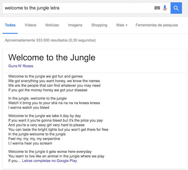 Agora é possível encontrar letras de músicas direto nas buscas do Google, sem precisar visitar outros sites. Uma parceria entre a gigante da web e a empresa canadense LyricFind tornou isso possível para letras licenciadas por de mais de 4000 empresas do ramo, incluindo as principais gravadoras do mundo.