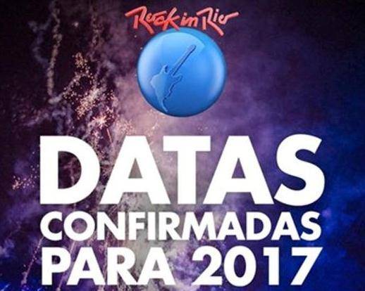 A organização do Rock in Rio divulgou nesta quarta-feira as datas para a próxima edição do festival no Brasil, que será realizada em 2017. Segundo a página oficial do evento no Facebook, os shows ocorrerão em setembro, dos dias 15 a 17 e de 21 a 24. No próximo dia 27, será revelado o primeiro artista confirmado no line-up.