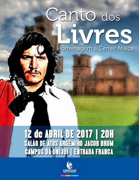 Cenair Maicá, tronco missioneiro, expoente da música gaúcha ao lado de nomes como Jaime Caetano Braun, Noel Guarany e Pedro Ortaça, será homenageado no Salão de Atos Argemiro Jacob Brum, no dia 12 de abril. O show, intitulado Canto dos Livres, terá entrada franca, porém, o acesso será garantido mediante a apresentação de convite, que está disponível na recepção do Campus Ijuí na Coordenadoria de Marketing da Unijuí.